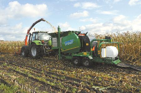 The Agronic silage baler can be towed through the field with a forage harvester blowing silage into the hopper, compressing and then dropping wrapped bales out the back. It can also be operated while stationary, feeding silage into the hopper from a silo or wagon.