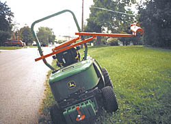To solve the problem, he built a 150-lb. counterweight to hold the mower stable on slopes. The counterbalance system consists of a frame made from 2-in. rectangular tubing that bolts onto the mower's ROPS. A hinged arm is fitted with a 6-in. dia., 2-ft. long solid steel weight. Pulling on a lever retracts a hydraulic cylinder to bring the counterweight to a nearly horizontal position, keeping the mower from tipping over on hillsides. Pushing on the lever extends the cylinder to drop the counterweight straight down alongside the mower.