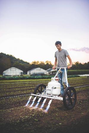 "The Pyroweeder is designed to straddle a 30-in. bed," Dysinger says. With an offset and reversible handle, the operator walks in a path next to the row to avoid compacting the soil bed. The size of the unit makes it easy for customers to push. Typically the Pyroweeder is used by gardeners with 1 to 5 acres.