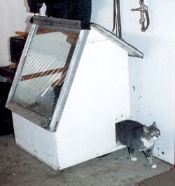 Their solar cat shelter stays warm in winter, thanks to their "hot house" idea of incorporating a slanted glass face into the front of the shelter, which also features a "secret under-floor passageway" for getting in and out.