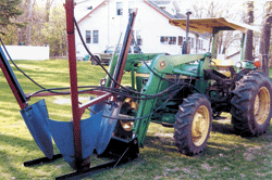 "It'll dig out a 3 in. dia. tree in 2 minutes or less," says Duane Myklejord about the big hydraulic tree spade he built to mount in place of the loader bucket on his Deere tractor.