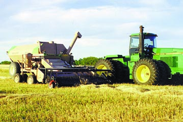McLeod's idea is to use two machines instead of a single combine. The "harvester" mounts on an existing tractor. It uses a rotary system to separate grain, chaff, and weed seeds from the straw, which is left in the field. The partially threshed grain falls through the concaves and is then augered through an airlock to a pneumatic tube that blows it into a grain tank. The harvester can be fitted with either a direct cut or pickup-type header. It features a large 1,200 bu. grain box compared to the 250 to 300 bu. hoppers on most existing combines.