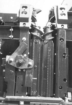 The "Harvestec" corn head, imported from Europe, quick-taches to most popular combine brands. The head is equipped with rotary chopping knives, one set for each row, that operate together with the snapping rolls and are positioned just below them. The head is also fitted with an electrically-controlled snapping plate adjustment that allows you to control spacing of the snapping plates right from the cab.