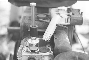 "One of the tools is used to lift the valve and the other for rotating. The lifting tool is made from two flat washers about 1/16-in. thick. The lower washer is notched to make room for the valve stem. It slides under the valve head. I welded three 1 1/2-in. long spacers vertically to the edges of the washers -- two opposite each other and across from the center line of the hole and the other opposite the notch on the washer -- to form a valve head cage assembly. A small slide weight is placed on a 6-in. long bolt, then a nut is threaded on so that a 3/4-in. length of threads is exposed. Then the bolt is inserted into the top washer on the lifter and tightened with another nut.