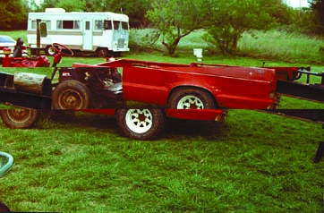 When driving the machine, he sits on a seat made of 2 by 12-in. wood mounted in front of the pickup bed. He also has a tow bar mounted on front of the machine so he can transport it on the highway.