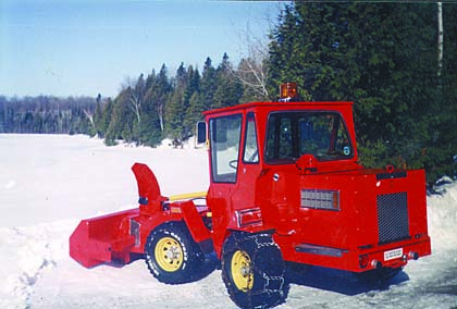 "It's unbelievable how much heavy snow it'll handle," says Denis Desjardins, Alcove, Quebec, about the articulated 4-WD snow-blower he built. He used a variety of parts, including the chassis and wheels from a Chevrolet 1/2-ton 4-WD pickup, a 6-cylinder Oldsmobile gas engine, and the front axle and transmission off a Honda Civic 4-WD car.