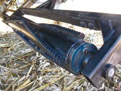 Eliminate GMO hybrid damage to tires and other equipment with the Kitchel stalk roller. Unlike the various stalk choppers on combines and post harvest or bush hogging alternatives, Brandon Kitchel's solution reduces wear without adding significant fuel costs and time in the field. "The stiff GMO stubble rips up tires and speeds the wear on planter seed tubes, wiring harness covers and hoses, anything that's made of plastic," says Kitchel. "Stalk choppers on combines are a drain on power, and during or following harvest all choppers take added fuel. Plus they often leave 4 in. or more of the stiffest stubble in place." Kitchel's stalk roller has little impact on fuel use and doesn't require an added trip across the field. The only power required is to pull the rollers across the field as the combine moves forward. The 2-row rollers lower to the ground when the head lowers. "I knew I needed more down pressure than just the rollers," says Kitchel. "I've seen rollers that push over the stalk, and then the stalk stands up again as they go by." Spring tension added to the weight of the units presses the stalks down and crushes them at the crown. Initially the springs added about 100 lbs. of pressure to each roller. Kitchel has since added another 50 lbs. of pressure, though that may be more than is needed. "I knew we needed to damage the root ball where the resins and sugars all collect when the stalk dries down," explains Kitchel. "Those sugars set up like a rock as they dry. With the springs, my rollers have enough down pressure to break the root ball off, uproot it or shatter it into the ground." Kitchel's first design was a single ground-driven roller that ran the length of the corn head. However, it didn't allow for contours, waterways and benches. After rolling more than 2,000 acres for several years, he worked with a local mechanical engineer to redesign it. Now, multiple 44-in. long sections each crush two rows of stubble. Kitchel notes that installation of the shorter sections is easier too. Rebar cleating that wraps around the steel rollers in a chevron pattern enhances the ground action of the roller. Kitchel uses 5/8-in. rebar, welding it to the smooth steel rollers. "The chevron pattern grabs the ground and walks over rocks better than the angle iron I first tried," he says. "It also smoothes out the ride." Kitchel tried his new patent pending design out on a few acres last fall. It worked well enough that he's now negotiating manufacturing rights with several companies. It's unsure at this time what the price will be or when the rollers will be available. "I am collecting emails and letters from people interested in buying rollers for their combines," he says. "When the details are worked out, I'll let people know."