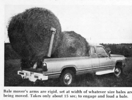 The second bale is held upright during transport. Loading time for each bale is about 15 seconds. Switches for operating the hydraulic unit, and the release for the carrying pins, run up to the pickup's cab.