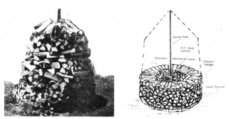 A Holzhaufen as high as 10 ft. will stand as long as the wood will hold up, and -- within a period of three months -- will probably shrink to about 8 ft. This shrinkage will continue as moisture is lost from the wood. Thus, the center indicator pole can be used as a measure of dryness. When the Holzhaufen has shrunk between 20 to 25%, the wood is ready to be brought in and burned.